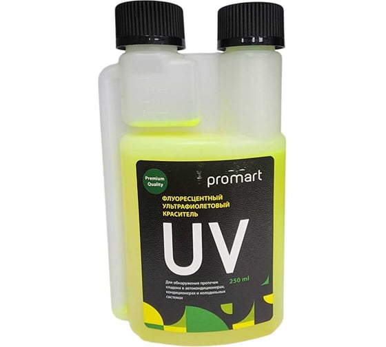 UV-краситель PROMART используется для обнаружения утечек фреона в системах охлаждения, кондиционирования и авто кондиционерах. Принцип обнаружения утечек основан на способности UV-красителя светиться в ультрафиолетовом излучении. Как источник ультрафиолета можно использовать UV-лампу.