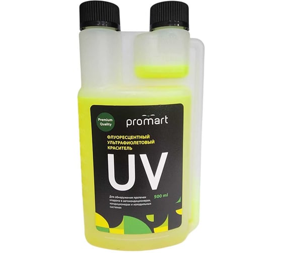 UV-краситель PROMART используется для обнаружения утечек фреона в системах охлаждения, кондиционирования и авто кондиционерах. Принцип обнаружения утечек основан на способности UV-красителя светиться в ультрафиолетовом излучении. Как источник ультрафиолета можно использовать UV-лампу.