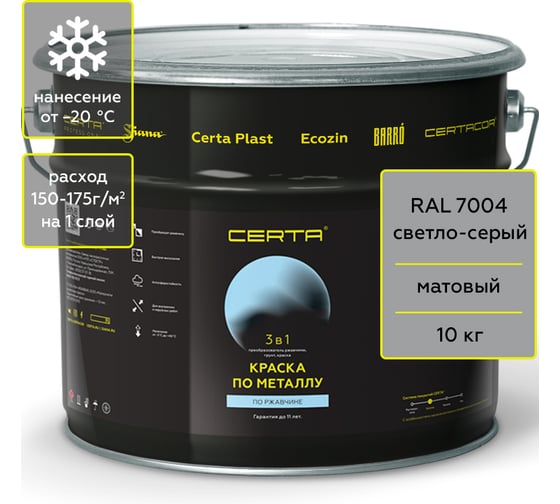 Краска 3 в 1 по ржавчине, металлу Certa серый матовый (~RAL 7004), 10 кг KRGL1025