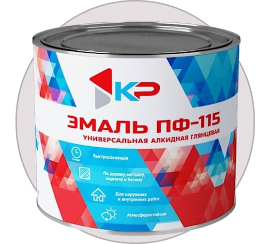 Краска быстросохнущая, атмосферостойкая КР ПФ-115 белая, 1,8 кг 4610044290693 применяют для окрашивания металлических, деревянных, ДВП, ДСП, кирпичных, гипсовых, бетонных поверхностей за исключением полов (деревянная мебель, оконные рамы, подоконники, дверные блоки и проемы, фасады зданий, гаражи, ограждения, решетки, металлические конструкции), эксплуатируемых в атмосферных условиях и внутри помещений. Покрытие обладает высоким глянцем и твердостью, устойчиво к воздействию воды, бытовых моющих средств и технических масел. Двухслойное покрытие эмали, нанесенное на подготовленную загрунтованную поверхность, в умеренном и холодном климате сохраняет защитные свойства в течение 4-х лет.