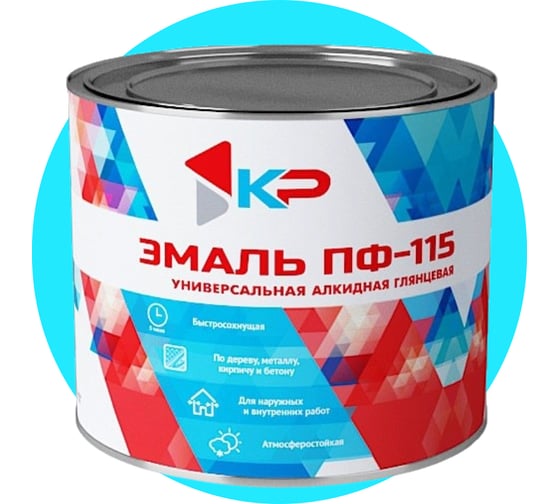 Краска быстросохнущая, атмосферостойкая КР ПФ-115 морская волна 1,8 кг 4610044290808 применяют для окрашивания металлических, деревянных, ДВП, ДСП, кирпичных, гипсовых, бетонных поверхностей за исключением полов (деревянная мебель, оконные рамы, подоконники, дверные блоки и проемы, фасады зданий, гаражи, ограждения, решетки, металлические конструкции), эксплуатируемых в атмосферных условиях и внутри помещений. Покрытие обладает высоким глянцем и твердостью, устойчиво к воздействию воды, бытовых моющих средств и технических масел. Двухслойное покрытие эмали, нанесенное на подготовленную загрунтованную поверхность, в умеренном и холодном климате сохраняет защитные свойства в течение 4-х лет.