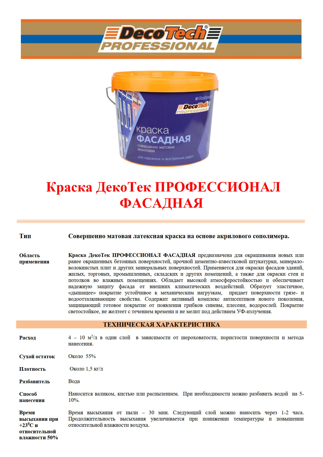 Cовершенно матовая латексная краска на основе акрилового сополимера DecoTech Professional ФАСАДНАЯ предназначена для окрашивания новых или ранее окрашенных бетонных поверхностей, прочной цементно-известковой штукатурки, минерало-волокнистых плит и других минеральных поверхностей. Применяется для окраски фасадов зданий, жилых, торговых, промышленных, складских и других помещений, а также для окраски стен и потолков во влажных помещениях. Обладает высокой атмосферостойкостью и обеспечивает надежную защиту фасада от внешних климатических воздействий. Образует эластичное, «дышащее» покрытие устойчивое к механическим нагрузкам, придает поверхности грязе- и водоотталкивающие свойства. Содержит активный комплекс антисептиков нового поколения, защищающий готовое покрытие от появления грибков синевы, плесени, водорослей. Покрытие светостойкое, не желтеет с течением времени и не мелит под действием УФ-излучения.