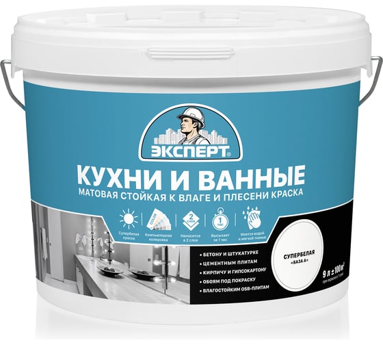 Краска для кухонь и ванных комнат ЭКСПЕРТ 9 л 26163 применяется для стен и потолков во всех типах помещений, включая кухни, ванные комнаты. Равномерно наносится, не разбрызгивается, не оставляет потеков при нанесении. Обладает высокой степенью белизны. Выдерживает легкую влажную уборку. Очень экономичная в применении. Наносится на бетонные и оштукатуренные поверхности, гипсовые и гипсокартонные плиты, структурные и стеклообои.