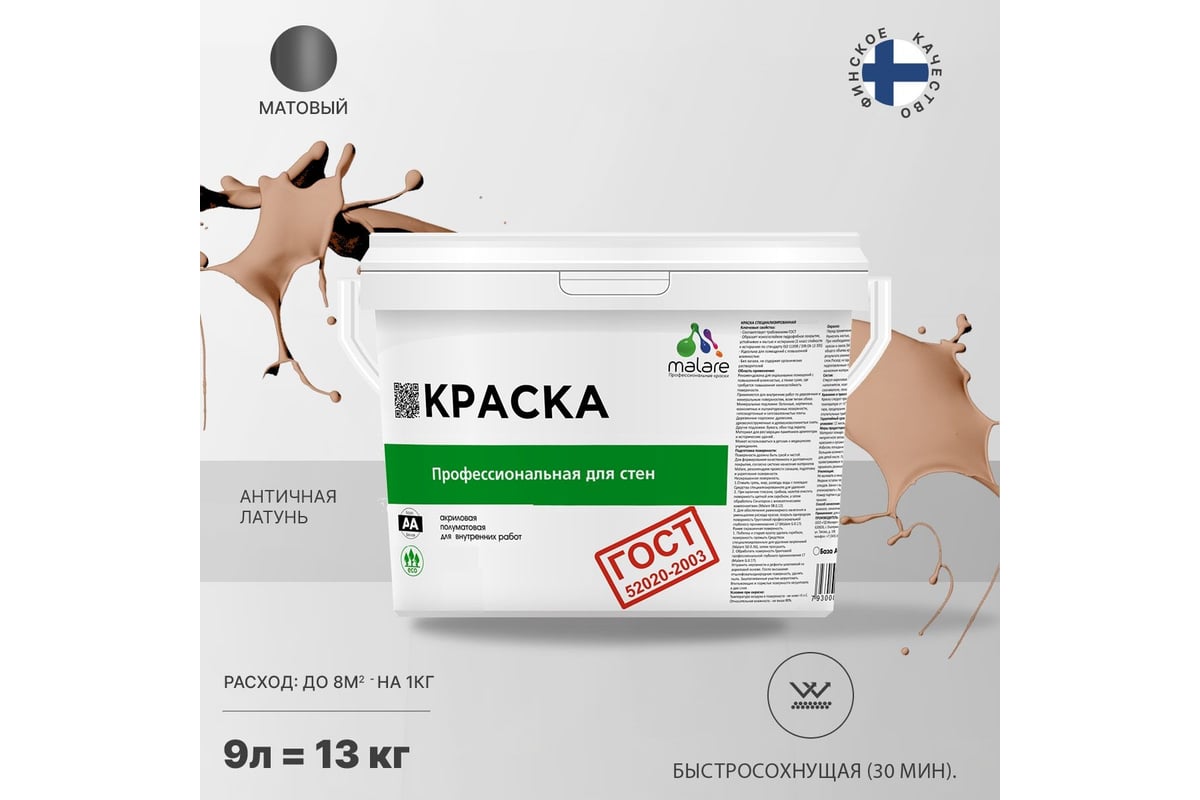 Краска для стен и потолков в сухих помещениях MALARE ГОСТ античная латунь, 9 л (13 кг) 2038123283282