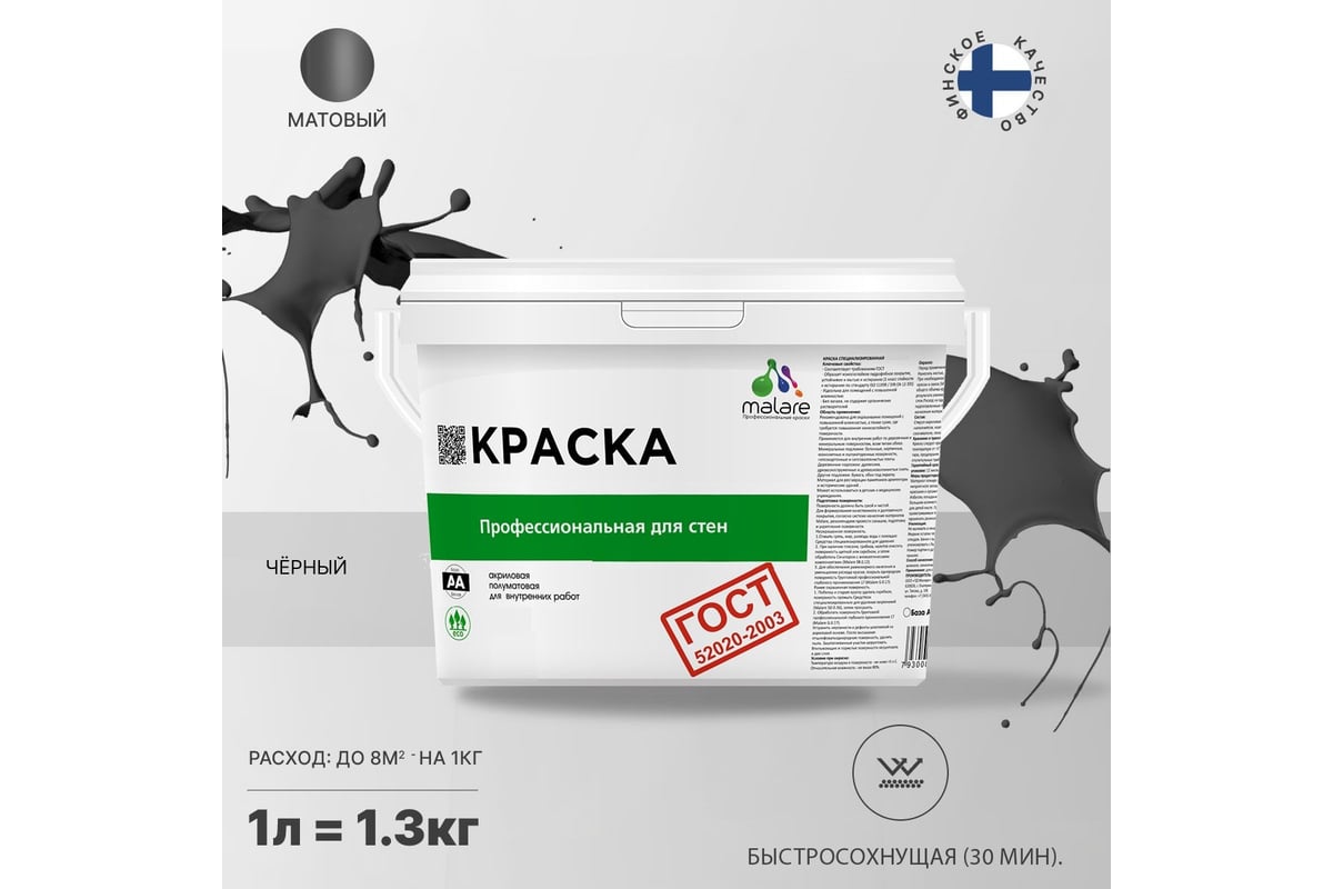 Краска для стен и потолков в сухих помещениях MALARE ГОСТ (черный; 1 л) 2036770245011