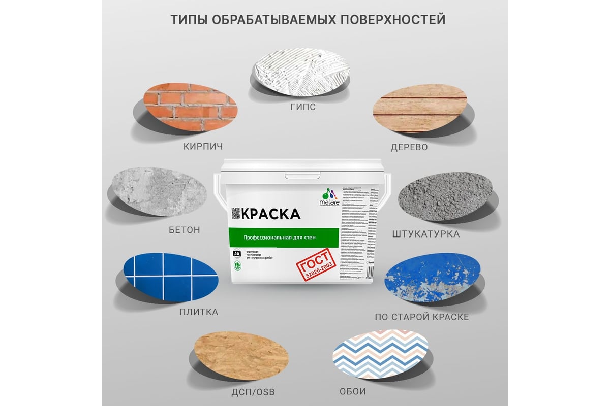 Все характеристикиКраска для стен и потолков в сухих помещениях MALARE ГОСТ производится на основе качественного российского сырья. Применяется для внутренних работ по деревянным и минеральным поверхностям, всем типам обоев.