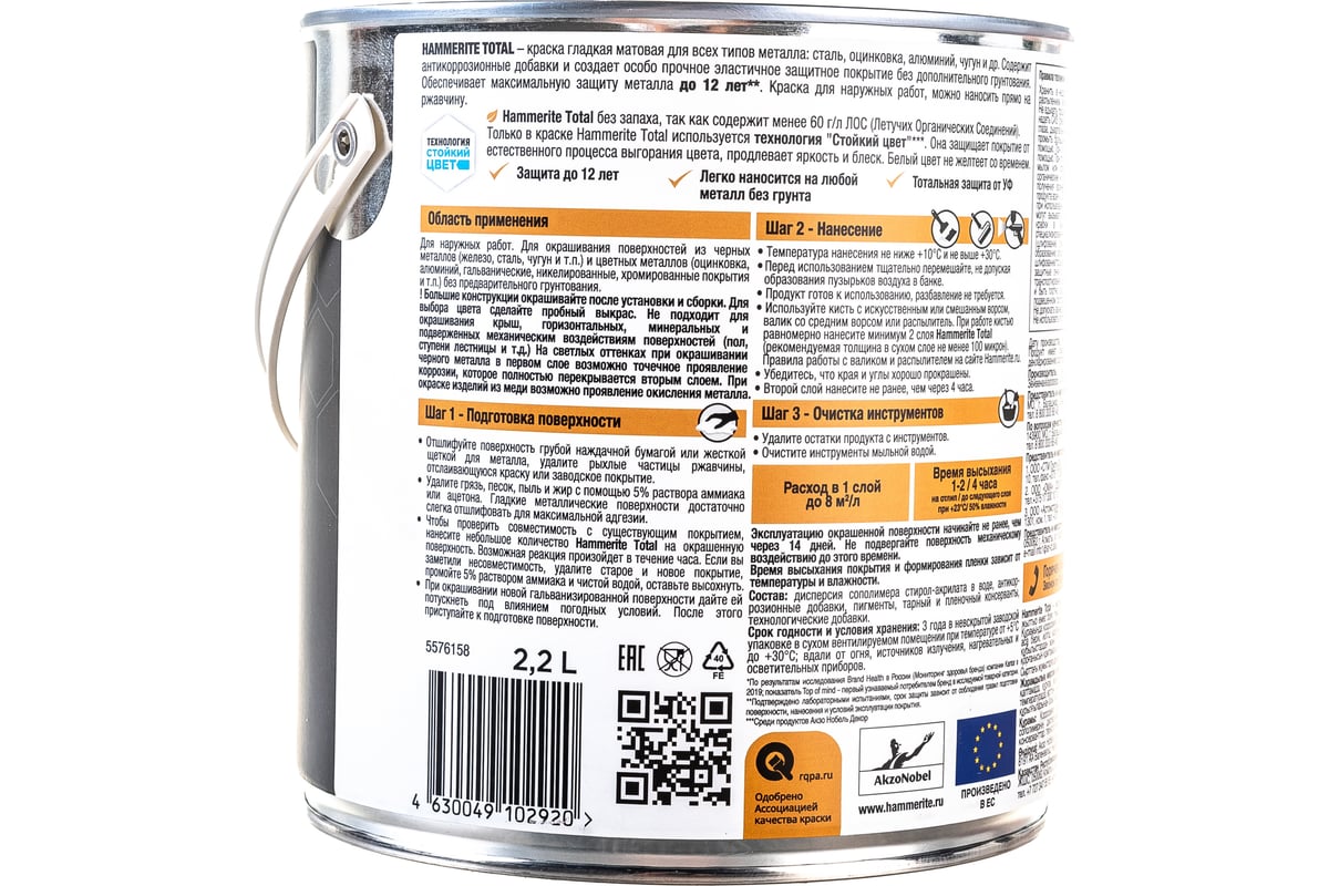Краска для всех видов металлов HAMMERITE TOTAL (по ржавчине; матовая; RAL 9005 черный; 2.2 л) 5576158 для всех типов металла: сталь, оцинковка, алюминий, чугун и др. Содержит антикоррозионные добавки и создает особо прочное эластичное защитное покрытие без грунтования. Можно наносить прямо на ржавчину. Обеспечивает максимальную защиту металла до 12 лет*. Образует эластичное покрытие. Без запаха, легко наносится и быстро сохнет. В краске Hammerite Total используется технология "Стойкий цвет".