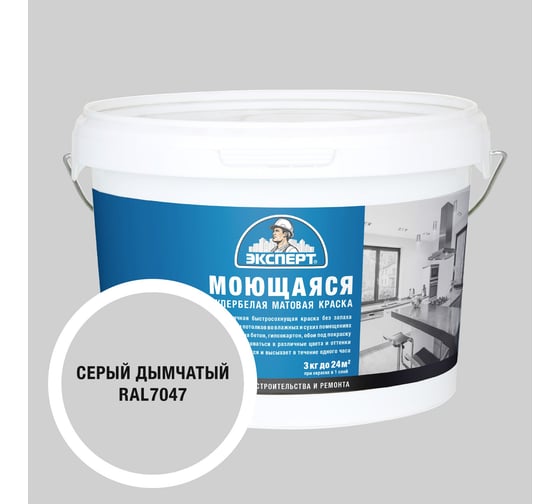 Краска моющаяся ЭКСПЕРТ цвет Серый дымчатый 3 кг 34853 применяется для окраски стен и потолков в кухнях, ванных комнатах. Идеальна для структурных и стеклообоев. Обладает высокой степенью белизны и укрывистости. Очень хорошая стойкость к влажному истиранию. Очень экономичная в применении. Наносится на бетонные и оштукатуренные поверхности, гипсовые и гипсокартонные плиты, структурные и стеклообои.
