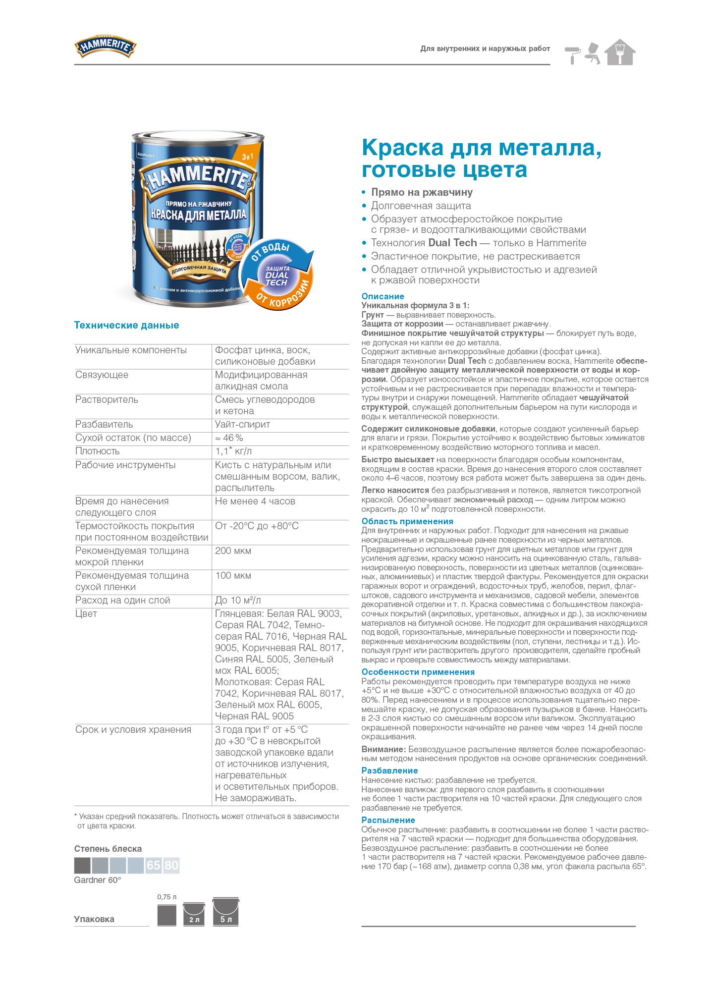 - Благодаря технологии Dual Tech c добавлением воска, Hammerite обеспечивает двойную защиту металлической поверхности от воды и коррозии до 8 лет. Образует износостойкое и эластичное покрытие, которое остается устойчивым и не растрескивается при перепадах влажности и температуры внутри и снаружи помещений. Hammerite обладает чешуйчатой структурой, служащей дополнительным барьером на пути кислорода и воды к металлической поверхности.