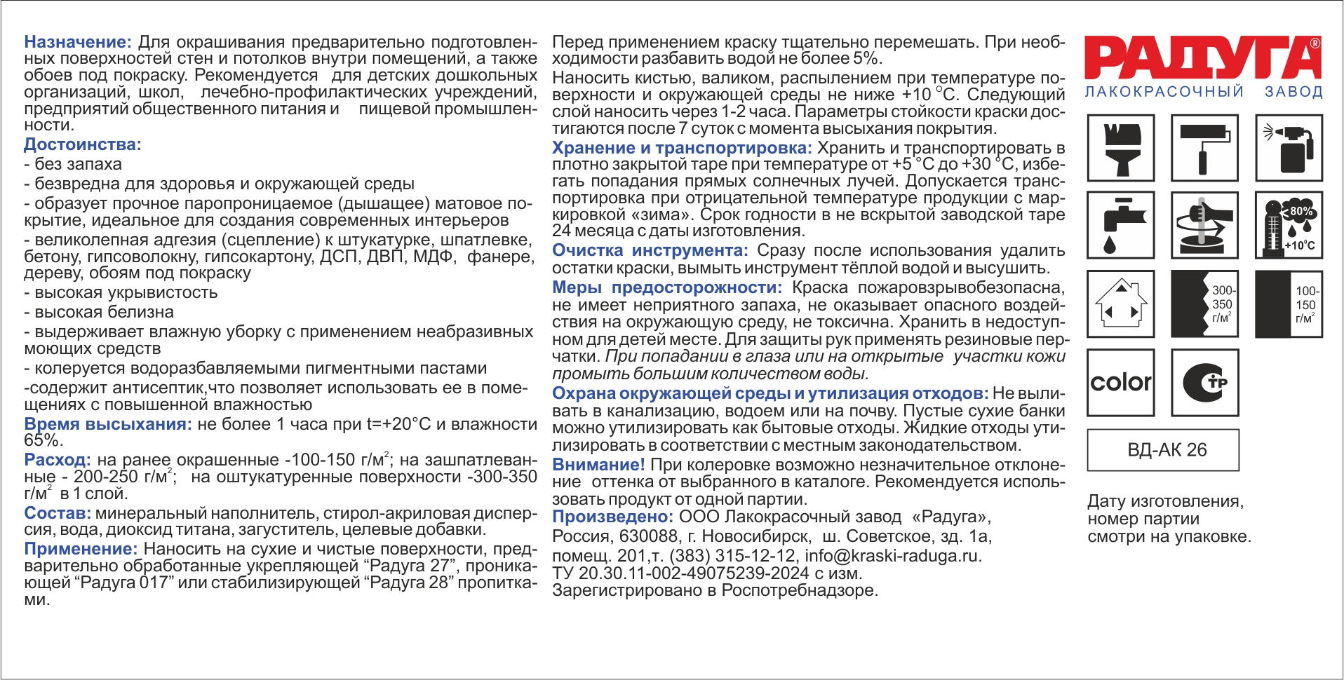 Для окрашивания предварительно подготовленных поверхностей стен и потолков внутри помещений, обоев под покраску. Рекомендуется для детских, учебных и медицинских учреждений.