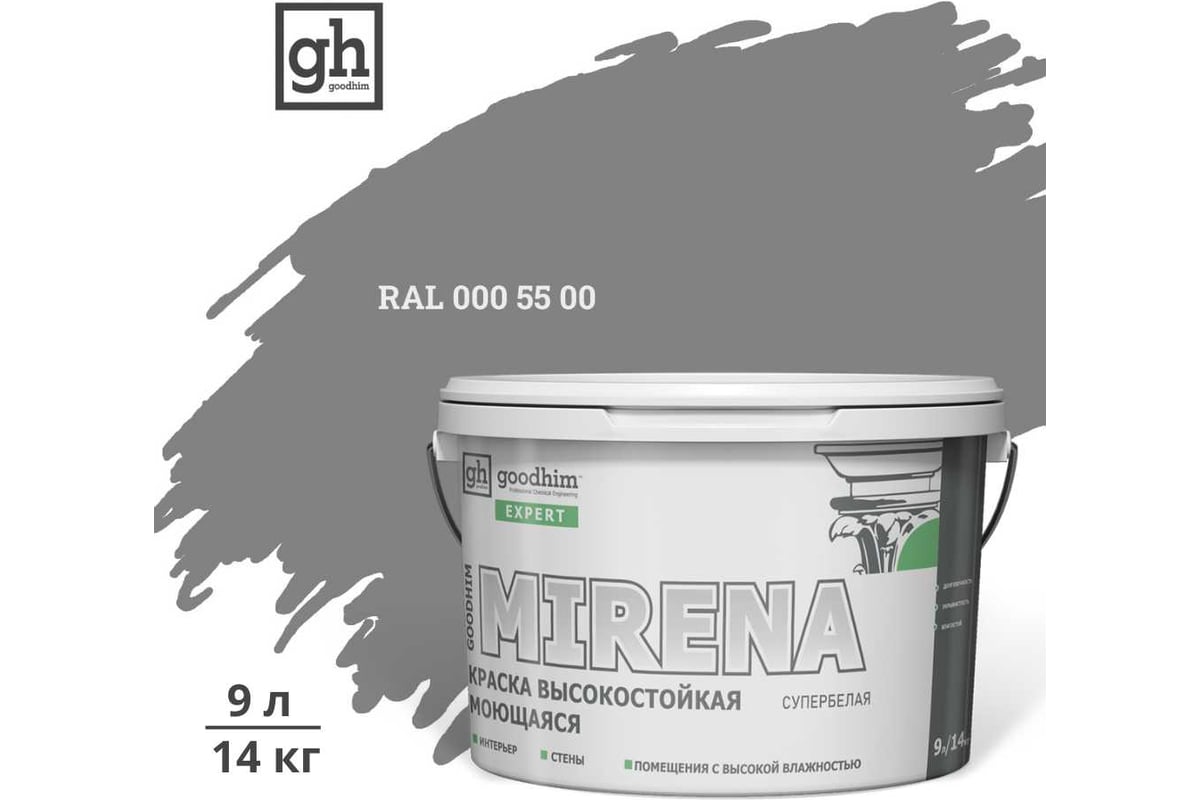 Краска колерованная GOODHIM D2 RAL 000 55 00 высокостойкая моющаяся EXPERT MIRENA База А, 9л/14кг 59456