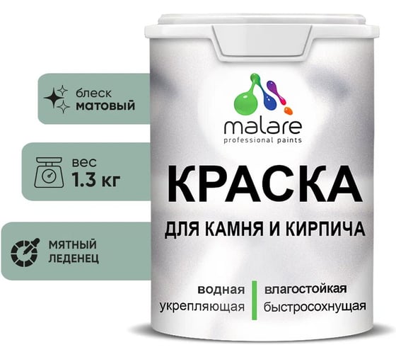 Краска MALARE для камня, кирпича, УФ-стойкая быстросохнущая, матовая, мятный леденец, 1,3 кг 2014567620005
