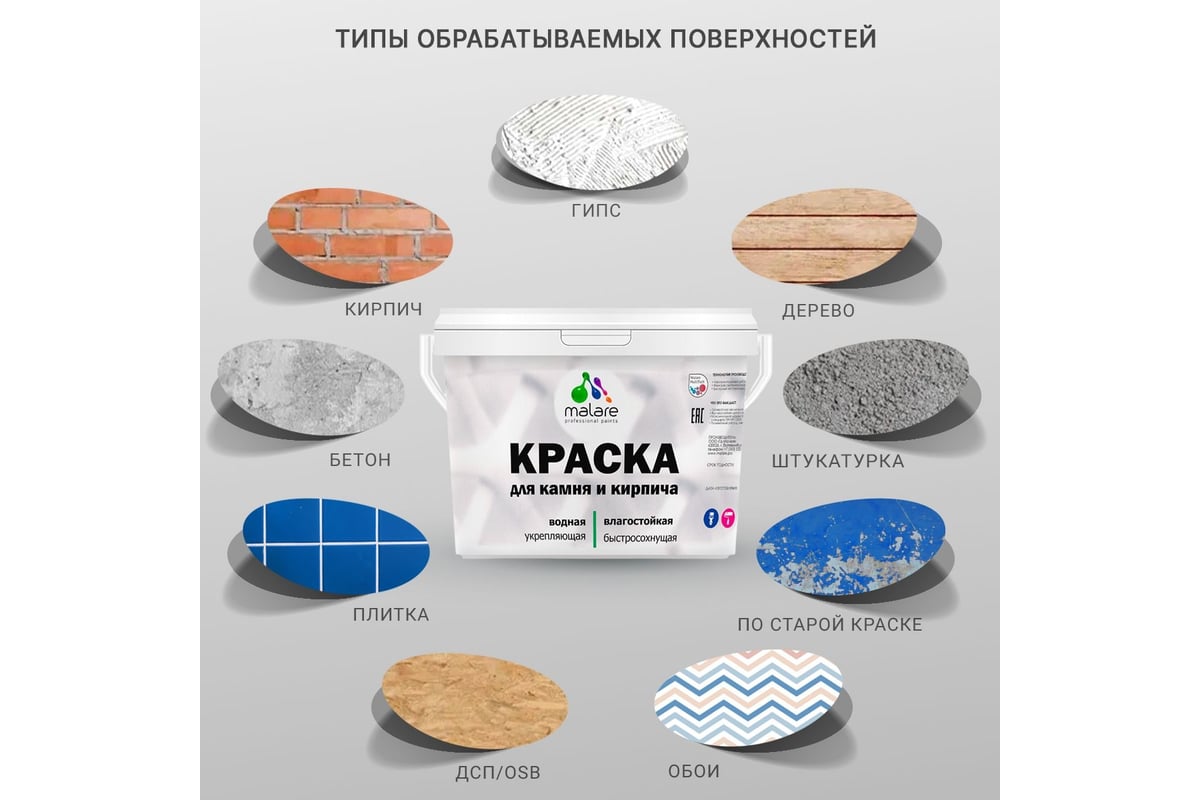 Краска MALARE для камня, кирпича, УФ-стойкая, быстросохнущая, матовая, 1 л - 1.3 кг - это профессиональная краска для окрашивания фасадов зданий, камня, кирпича и всех видов минеральных оснований.