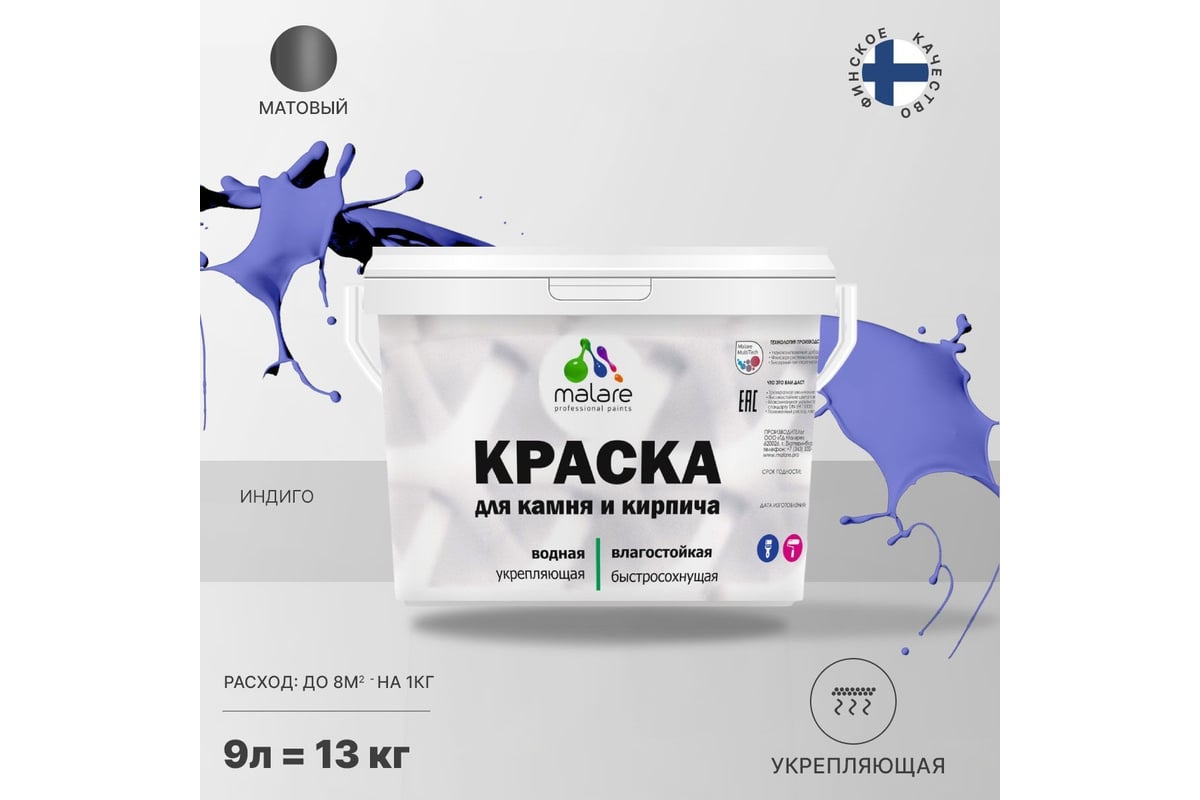 Краска MALARE для камня, кирпича, УФ-стойкая быстросохнущая, матовая, индиго, 13 кг 2036751568559