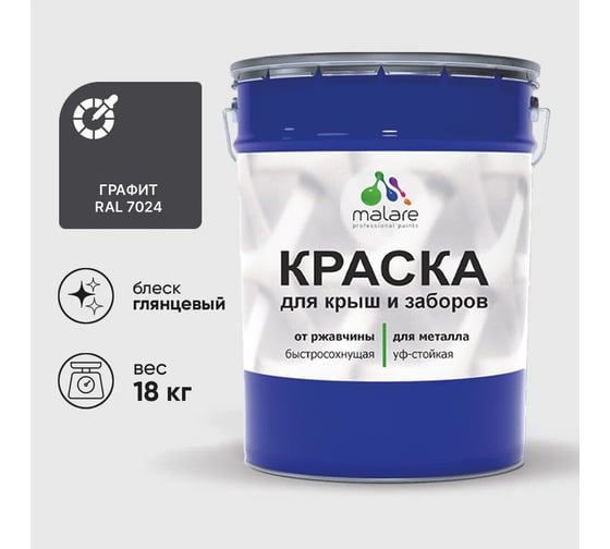 Краска по металлу MALARE для крыш и заборов, по ржавчине, быстросохнущая, износостойкая, глянцевый, графитово-серый(темный), 18 кг , 2014080932005