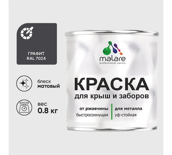 Краска по металлу MALARE для крыш и заборов, по ржавчине, быстросохнущая, износостойкая, матовый, графитово-серый(темный), 0,8 кг 2013932550008
