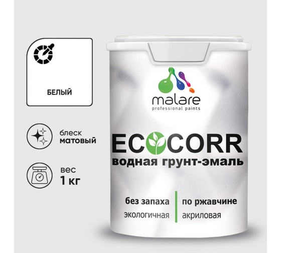 Все характеристикиГрунт-эмаль 3 в 1 Malare EcoCorr представляет собой водную краску на основе модифицированного акрила с высоким содержанием антикоррозионных пигментов и функциональных добавок.
