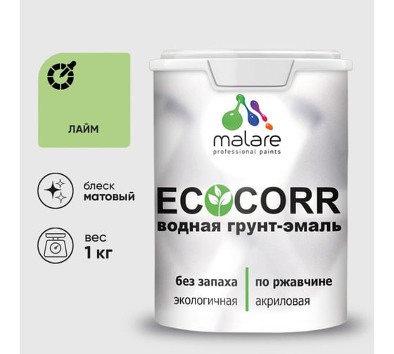 Грунт-эмаль 3 в 1 Malare EcoCorr представляет собой водную краску на основе модифицированного акрила с высоким содержанием антикоррозионных пигментов и функциональных добавок.