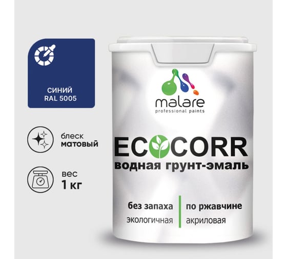 Грунт-эмаль 3 в 1 Malare EcoCorr представляет собой водную краску на основе модифицированного акрила с высоким содержанием антикоррозионных пигментов и функциональных добавок.