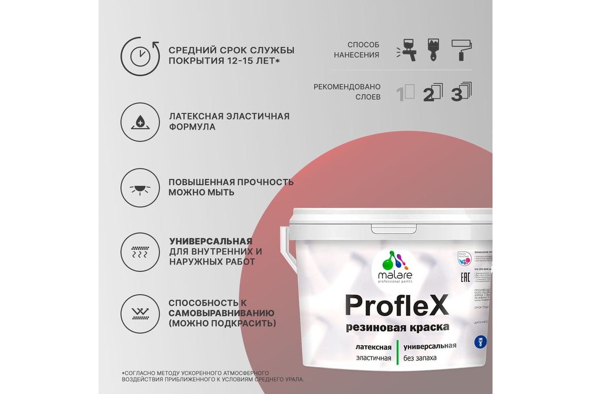 Краска для фасадов, крыш и цоколей MALARE ProfleX выполнена на основе бельгийского полимерного латекса. Предназначена для защитно-декоративного окрашивания любых деревянных, минеральных и металлических поверхностей, как фасадных, так и интерьерных.