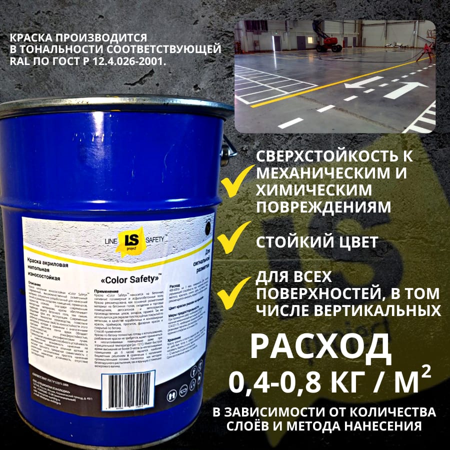 Краска для бетонного пола износостойкая разметочная Color Safety, цветная напольная матовая краска – специальный продукт собственного производства.
