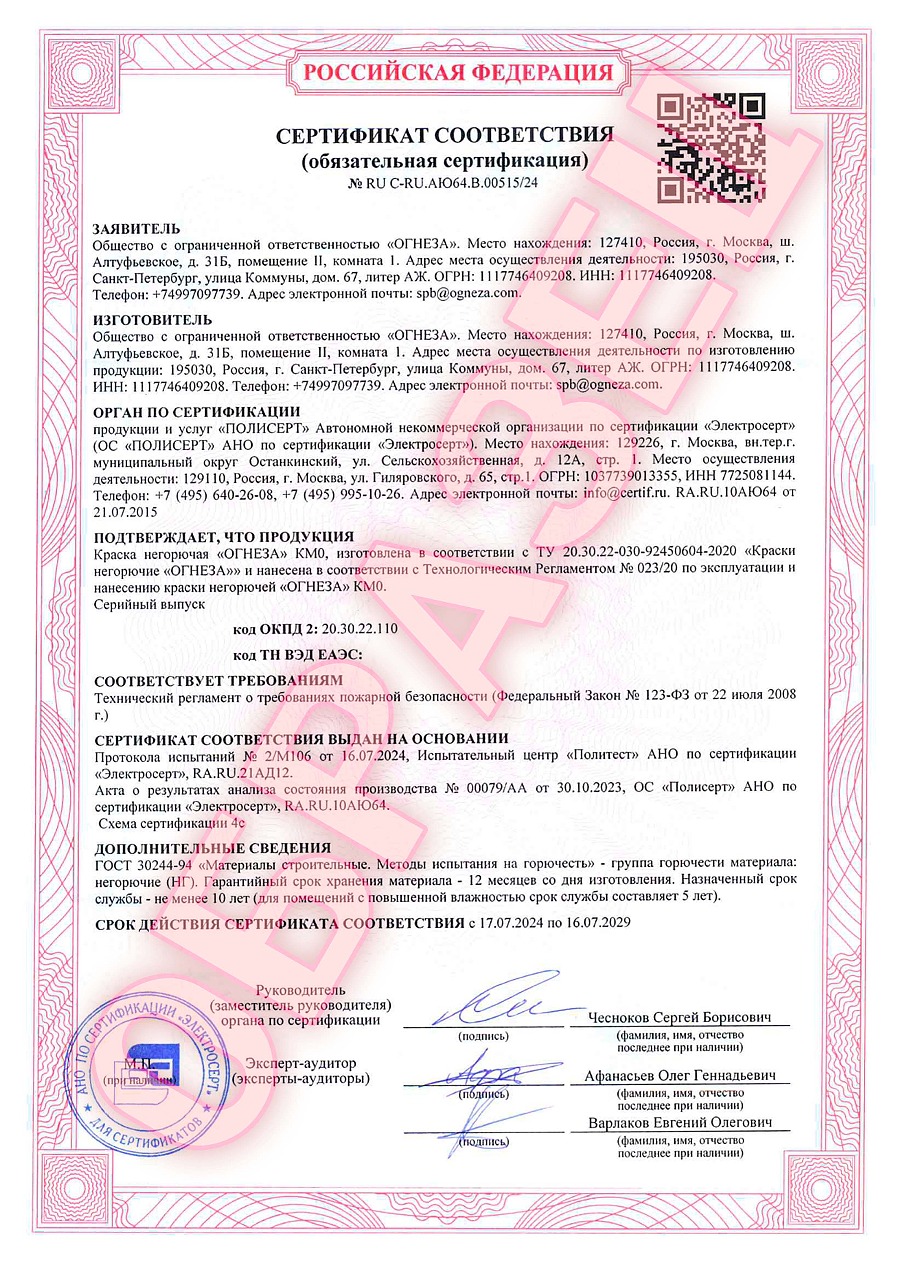 Однокомпонентная негорючая краска ОГНЕЗА КМ0 для минеральных поверхностей на водной основе без растворителей. Применяется для защиты от пламени и экстремальных температур стен и потолков из бетона, кирпича и оштукатуренных материалов. Сертифицирована для использования на путях эвакуации.