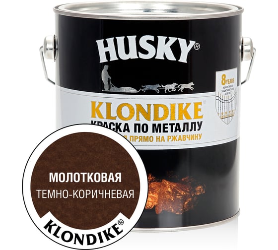 Краска по металлу с молотковым эффектом HUSKY KLONDIKE (темно-коричневая; 2.5 л) 25629 образует поверхность с молотковым эффектом. Краска создана по формуле 3 в 1 – это преобразователь ржавчины, грунтовка и декоративное финишное покрытие. Может наноситься прямо на ржавчину. Обеспечивает защиту металла и сохраняет декоративные свойства до 8 лет.