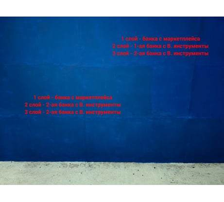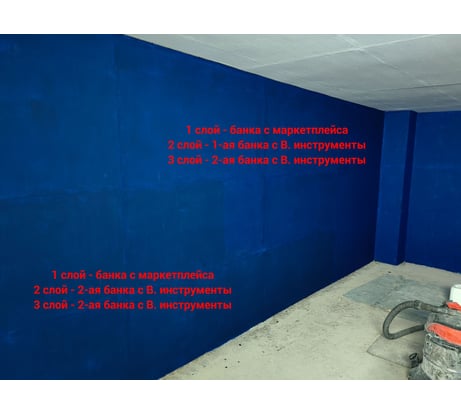 Сделал заказ на 2 банки синей краски 2,4 кг. Одна не пришла, пришлось заказывать в другом магазине (на известном маркетплейсе). Начал красить и начал с краски с другого магазина. Красил стены из ГВЛВ кисточкой шириной 100 мм в один слой, был жуткий непрокрас, краска явно разбавлена. Конечно предварительно пылесосил и грунтовал. Закончил банку и вскрыл банку из магазина "Все инструменты", удивился насыщенному яркому цвету, настоящий сигнальный синий. Да и краска в один слой ложилась гораздо лучше, не смотря на то, что я экономил и старался наносить тонкий слой. Жаль одной банки не хватило на все стены. Но мне всё таки пришла вторая банка 2,4 кг, забрал её во "Все инструменты". Открыл её, а оттенок цвета гораздо светлее, но я всё же начал красить недокрашенное. После высыхания краска ощутимо темнеет, но всё же оттенок отличается от настоящего яркого сигнального синего из первой банки купленной во "Все инструменты". Нанёс третий слой, стало лучше, но всё же цвет разница цвета из разных банок всё равно видна. Дублирую некоторые фото надписями, сколько слоёв и какой краски нанесено. Скорее всего мне попались банки из разного разлива. К магазину "Все инструменты" претензий нет, я думаю проблема у производителя. Красил при температуре +9 +11 градусов Цельсия. По расходу указано всё верно и даже с запасом. Если бы я знал, что оттенок в разных банках может отличаться, я бы сразу взял одну банку на 5 л и покрасил бы ей все стены в 1 слой. А если нужен второй слой, то берём вторую банку на 5 л и второй слой красим только из второй банки. Брал тут же, во "Все инструменты" такую же белую краску в двух разных банках. Там всё отлично, красил ГВЛВ потолок.