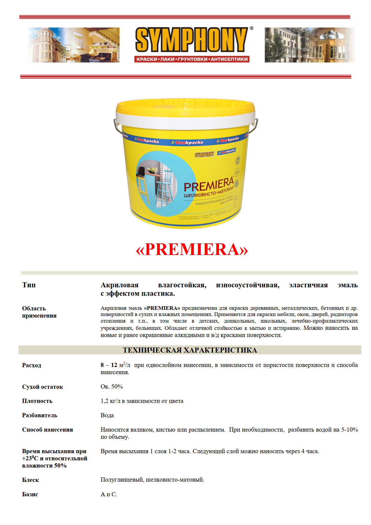 Краска SYMPHONY в/э, премьера А п/гл, 1/0.9л пласт., oсновной 00-01100424
