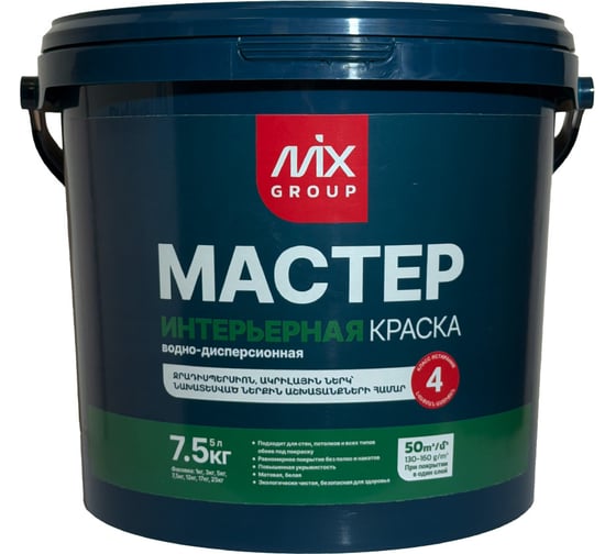 Высококачественная водно-дисперсионная интерьерная белая матовая краска (база А) производства Армении на основе химических компонентов BASF. Для внутренних работ. Без запаха. Класс истирания - 4. Быстросохнущая. Время высыхания 1-2 часа. Подходит для поверхностей на минеральной, древесной основе и других покрытий, не требующих влажной уборки и мокрого истирания. После высыхания образует ровное матовое белоснежное покрытие. Легко наносится, быстро высыхает, без запаха, не желтеет. Хорошая адгезия и укрывистость.