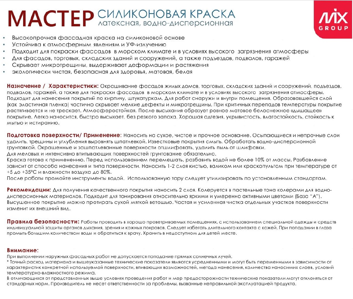 Высококачественная водно-дисперсионная силиконовая белая матовая краска (база А) производства Армении на основе химических компонентов BASF. Для внутренних и внешних работ. Без запаха. Класс истирания - 1. Быстросохнущая. Время высыхания 1-2 часа. Подходит для нанесения покрытий по кирпичу, бетону, штукатуркам. Частично скрывает мелкие дефекты и микротрещины. Атмосферостойкая. После высыхания образует ровное матовое белоснежное покрытие. Легко наносится, быстро высыхает, без запаха, не желтеет. Хорошая адгезия и укрывистость.