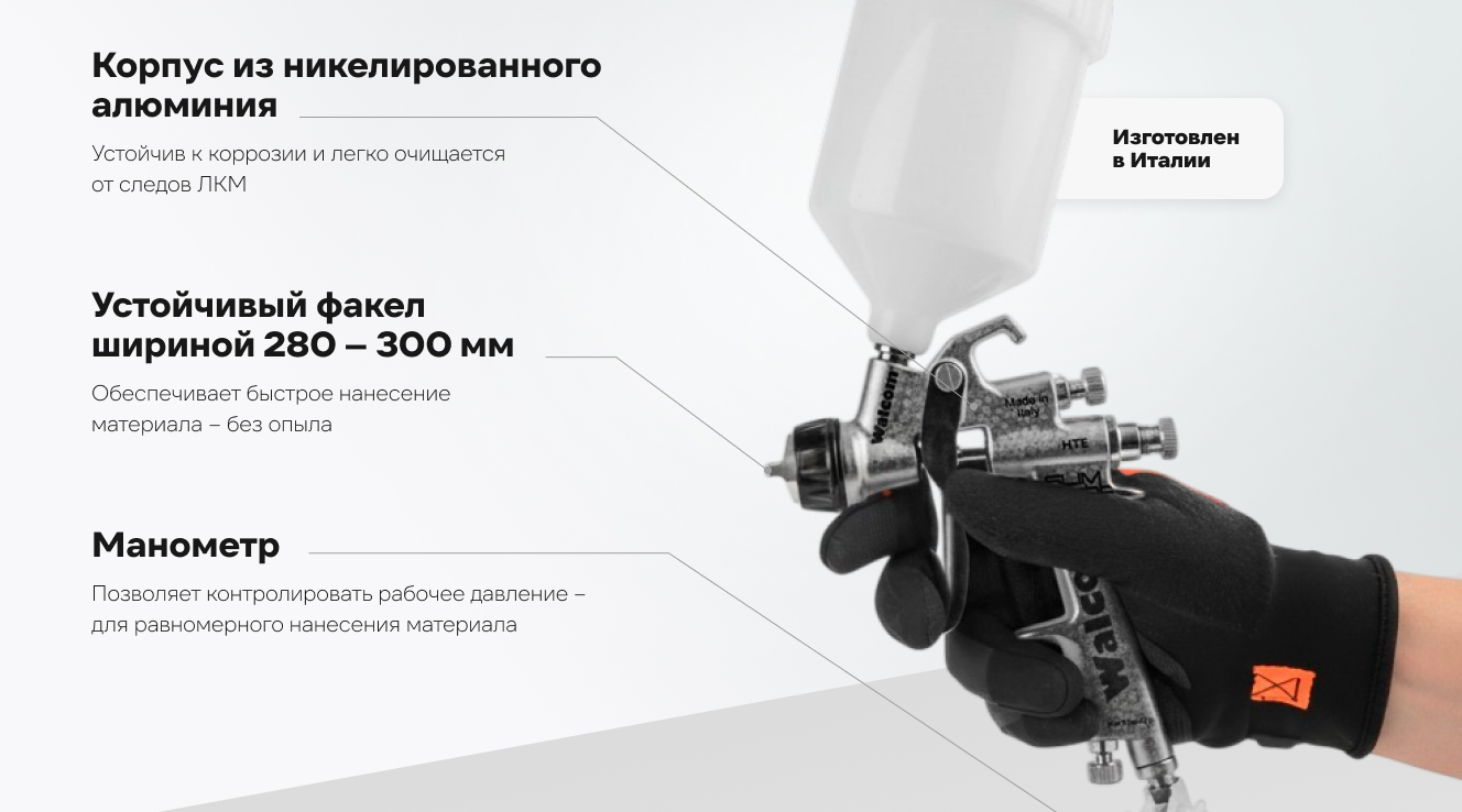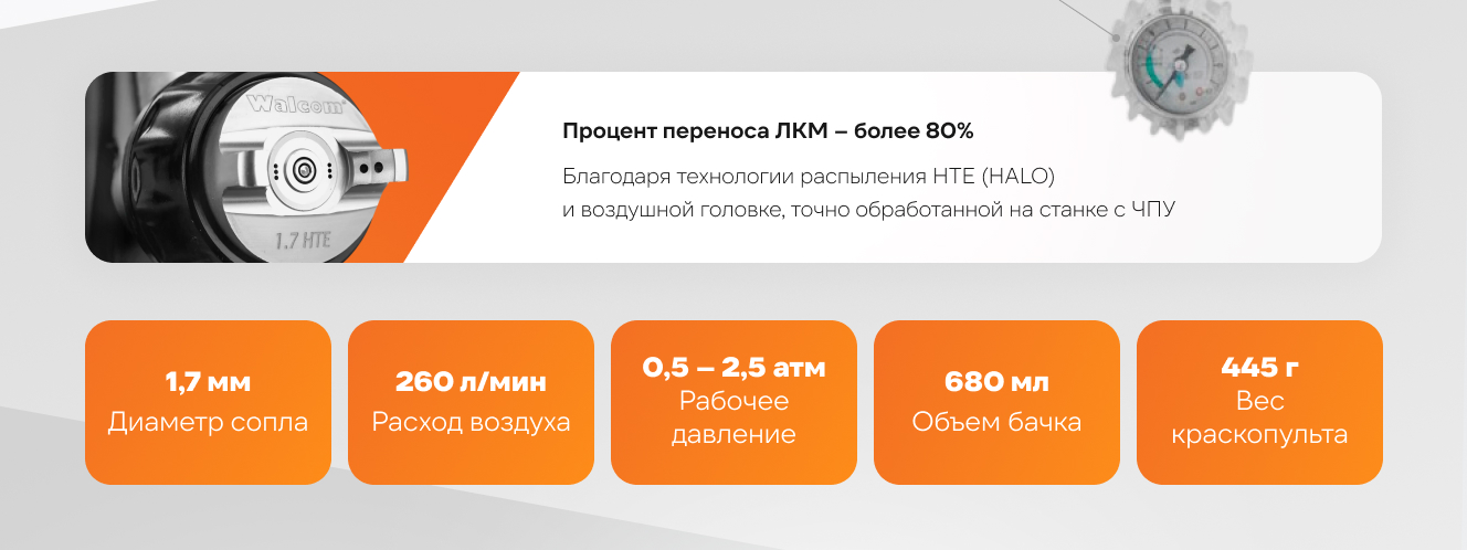 Краскопульт с манометром WALCOM SLIM XLIGHT S HTE 1.7 мм 823017 специально разработан для нанесения грунтов и порозаполнителей в кузовном ремонте, для нанесения морилок и лаков в мебельном производстве, а также для промышленной окраски.