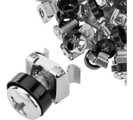 Набор крепежа для установки 19″ оборудования и аксессуаров на монтажные профили в телекоммуникационных шкафах и стойках. В комплект входят винт, закладная квадратная гайка и пластиковая шайба.