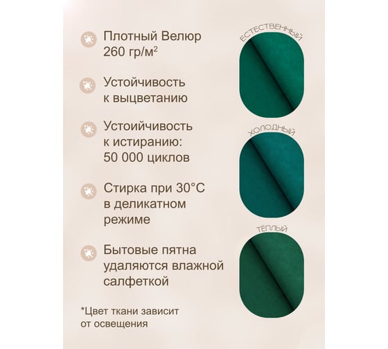 Внешний съемный чехол на молнии выполнен из высококачественного мебельного велюра с мягкой текстурой, плотностью 340 г/кв.м. Материал обладает высокими потребительскими и эксплуатационными свойствами Easy Way: супермягкость, износоустойчивость, цветоустойчивость, не токсичен. Ткань прекрасно держит форму, практична в использовании и проста в уходе (случайные пятна легко удаляются влажной губкой).