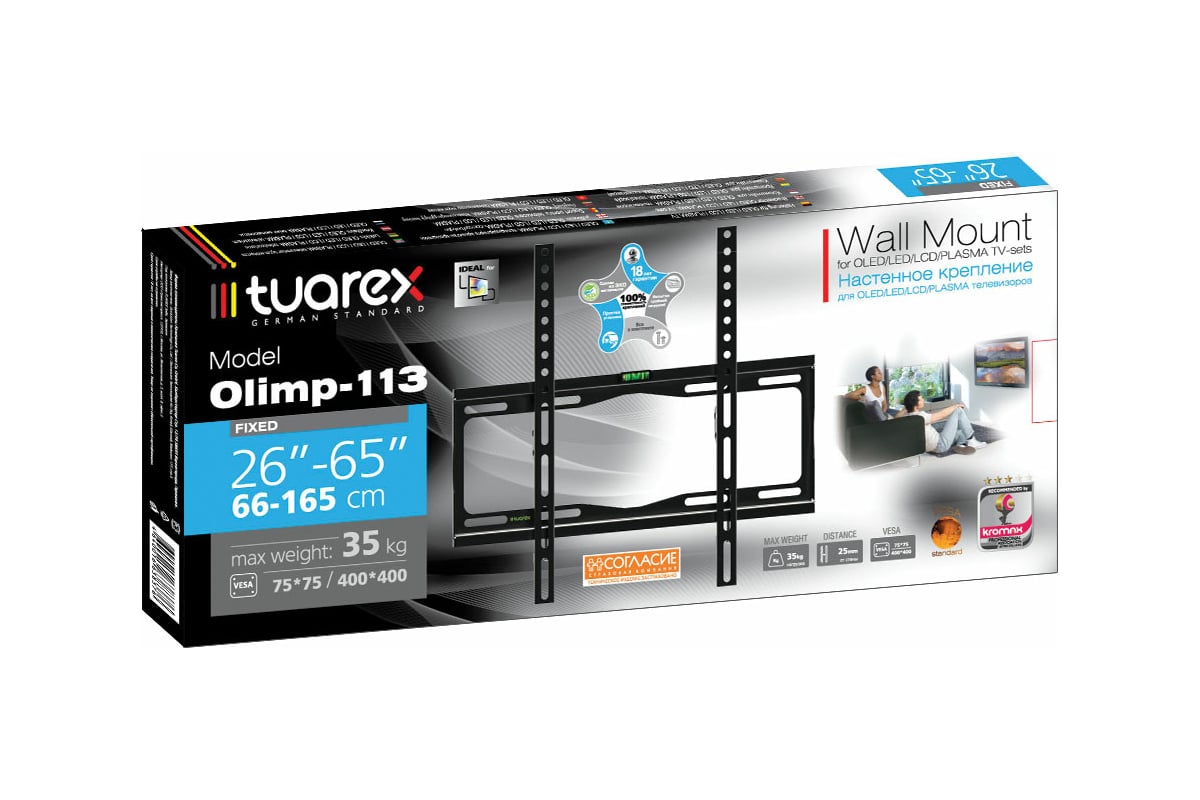 Кронштейн для LED/LCD телевизоров TUAREX OLIMP-113 black 40303 - настенный фиксированный кронштейн для телевизоров с диагональю от 26 до 65 дюймов. Кронштейн Tuarex Olimp-113 позволяет располагать телевизор максимально близко к стене, расстояние от стены – 25 мм.