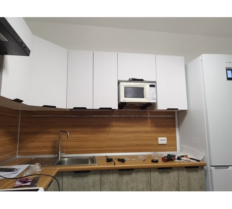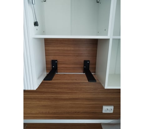 Ненадежный. При монтаже сварной шов на одном кронштейне разошелся. СВЧ среднего размера не более 9кг заставляет сильно прогибаться, пришлось докупать опоры. Крепеж для плоской отвертки тоже сомнительный элемент.