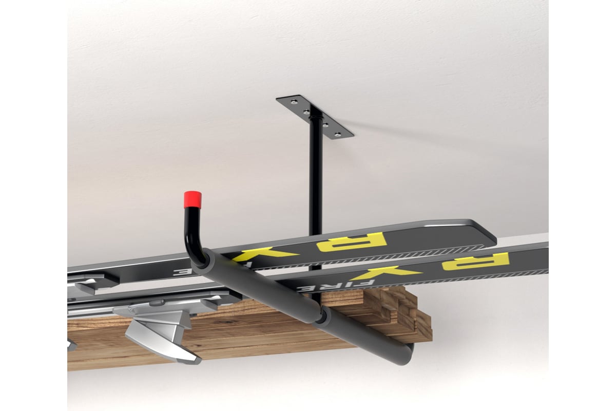 Стальной Т-образный кронштейн для установки под потолок. Прорезиненный элемент предотвращает скольжение и обеспечивает прочность хранения вещей на кронштейне. Можно использовать как отдельно, так и в паре. Хороший вариант для хранения спортивного инвентаря, в частности, лыж. Выдерживает большие нагрузки. Для установки понадобятся дюбели и саморезы.