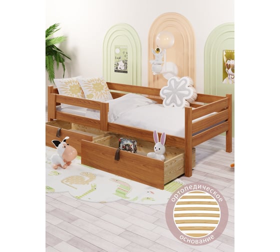 Кровать односпальная подростковая Solarius из массива сосны, с ортопедическим основанием, 140x80 см, габариты 150x90, с двумя выкатными ящиками, цвет ольхи det80-140olha-orto-2yash