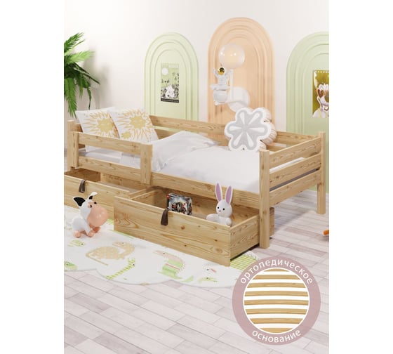 Кровать односпальная подростковая Solarius из массива сосны с ортопедическим основанием, 180x80 см (габариты 190x90), с двумя выкатными ящиками, без покраски det80-180-orto-2yash