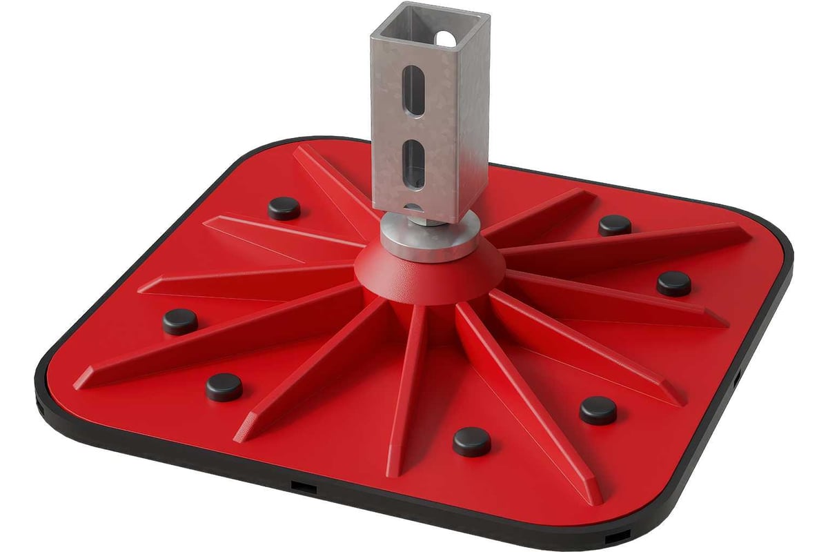 Антивибрационный коврик из термоэластопласта исключает продавливание гидроизоляционного слоя и препятствует скольжению опоры на кровле. Препятствует скольжению опоры на кровле. Опора поставляется в комплекте с вертикальным или горизонтальным кронштейном для страт-профиля 41х41 мм. Возможность компенсации уклона крыши до 8° и вращение на 360° обеспечивает простую быструю установку кровельной опоры.