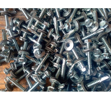 Саморез имеет шестигранную головку, полную резьбу по всей длине стержня, наконечник в виде бура и шайбу с герметизирующей EPDM-прокладкой.