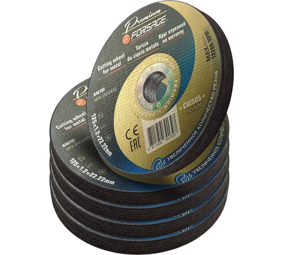 Отрезной диск 125×1,2×22,2 мм от бренда Forsage представлен в комплекте из 50 штук, что делает его отличным выбором для частого использования в профессиональной и бытовой металлообработке.