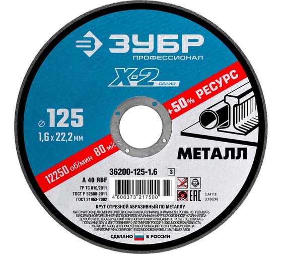 Круг отрезной X-2 Зубр 36200-125-1.6_z03 предназначен для угловых шлифовальных машин и ручных резчиков. Применяется для резки металлических деталей и заготовок, чугунного литья, строительной арматуры и других материалов.