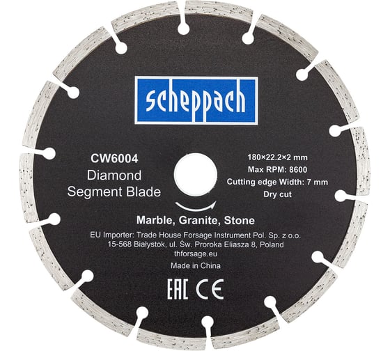 Круг отрезной 180×22,2×2 мм от бренда Scheppach – это высококачественный алмазный диск Turbo, предназначенный для сухой резки твёрдых материалов. Благодаря ширине режущей кромки 7 мм он обеспечивает чистый и аккуратный рез, сохраняя долговечность и стабильность работы. Диск подходит для обработки мрамора, гранита и камня, что делает его универсальным инструментом для строительных и отделочных работ.