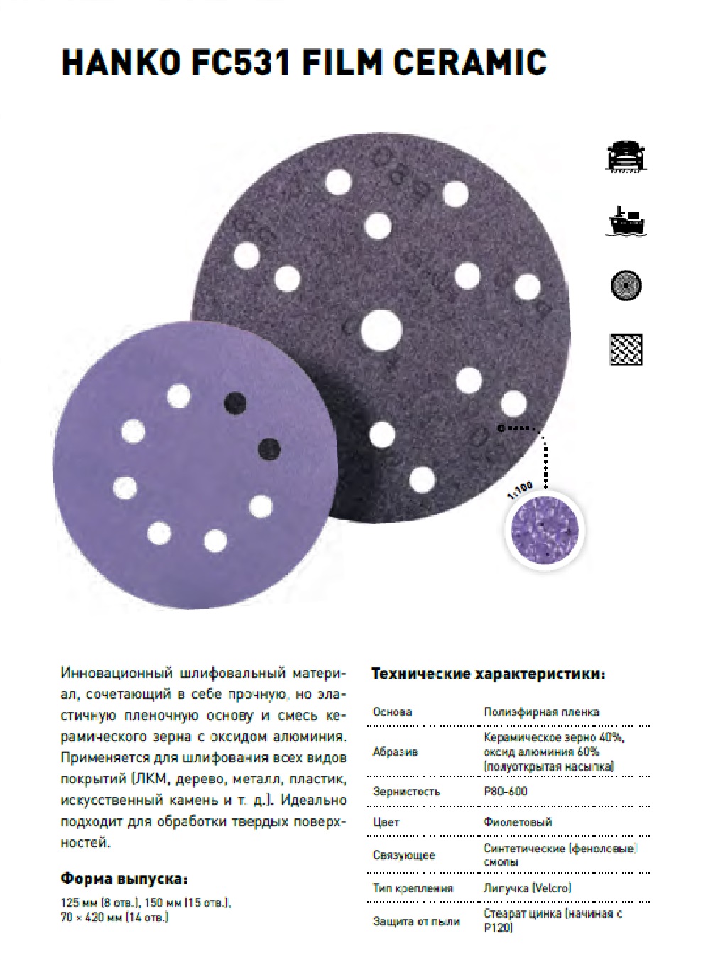 Круг шлифовальный Film Ceramic FC531 (125 мм; 8 отв.; Р220; 100 шт) Hanko FC531.125.8.0220 сочетающий в себе прочную, но эластичную пленочную основу и смесь керамического зерна с оксидом алюминия. Применяется для шлифования всех видов покрытий (ЛКМ, дерево, металл, пластик, искусственный камень и т.д.). Идеально подходит для обработки твердых поверхностей.
