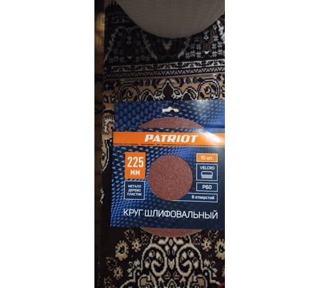Круг шлифовальный на липучке PATRIOT 225 мм, 6 отверстий, Р60, 10 шт 820010132