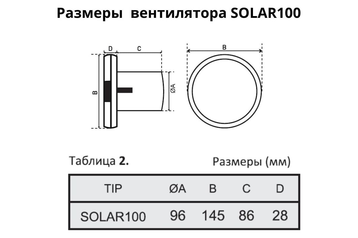 Технические характеристики VENTFAN.RU Solar100 с пластиковой черной панелью и обратным клапаном, D100мм