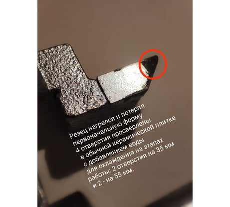 Один резец, даже не балеринка с двумя, что сбалансировало бы саму работу с таким сверлом. Малый ресурс резца, да, он выгорает при сверлении, даже если вы его будете поливать. Высокая нагрузка на вал инструмента при сверлении отверстий в большом количестве на крайне большем радиусе и высоких оборотах и вполне достаточная, чтобы отправиться за покупкой нового инструмента. Люфт в креплении резца в теле центровочного сверла и как следствие отклонения в размере отверстий при посредственной затяжке регулировочного винта.