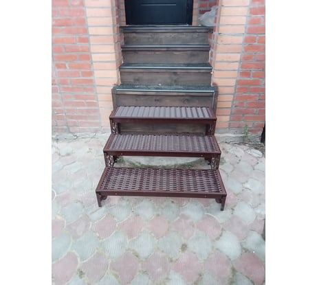 Лестница с тремя ступенями для крыльца серии «Классика». Прочная и устойчивая конструкция с покрытием из рифленого листового ПВЛ для надежного сцепления и долговечности. Лестница оснащена замкнутым металлическим контуром, предотвращающим сколы и механические повреждения. Скрытые крепежи упрощают уход и сохраняют эстетичный вид. Каркас обработан порошковой окраской по стандарту RAL 8017, что обеспечивает защиту от коррозии и долговечность. Возможно наращивание ступеней по длине и ширине.
