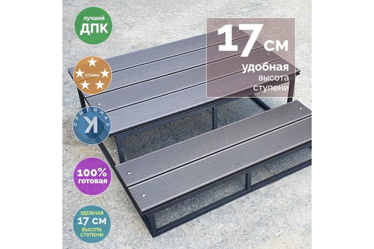 Лестница имеет комфортную глубину ступени 30.5 см и комфортную высоту ступени 17 см, что делает крыльцо удобным для детей и людей в возрасте!. Вес лестницы около 47 кг. Цельносварной металлокаркас из профиля 20х20 со ступенями из качественного декинга ДПК. Окраска атмосферостойкой ОСК Elcon. Лестница выдерживает вес не менее 250 кг.